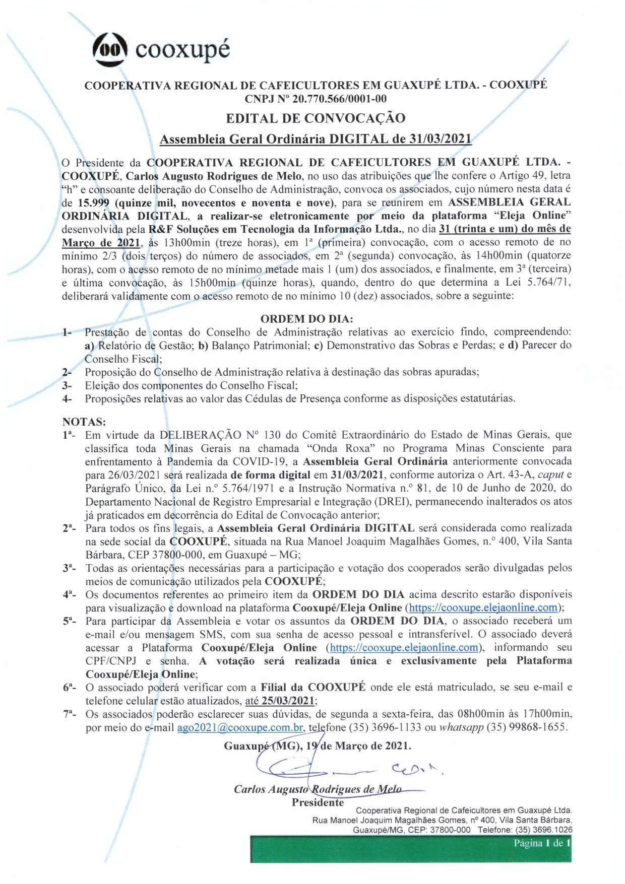 Cooxupé publica edital de convocação de Assembleia Geral Ordinária Digital