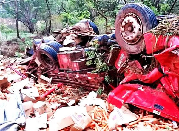 Dois caminhões seguiam pela perigosa rodovia carregados de legumes, quando o motorista Ricélio Oliveira Sarmento (30 anos) teria perdido o controle direcional, capotou e logo em seguida saiu da pista.