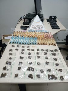 Os policiais identificaram o suspeito como sendo um adolescente de 17 anos, morador naquele endereço. Buscas foram realizadas e encontrados, inicialmente, cinco invólucros transparentes com substância análoga à maconha e 70 reais em dinheiro.