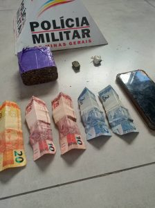 Nessa ocorrência, os militares apreenderam 15 pedras de substância análoga ao crack e 13 buchas de substância análoga à maconha prontas para o comércio, um pedaço de espelho, uma lâmina e quase 700 reais em dinheiro.