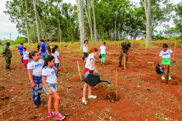 Alunos de escola municipal participam de plantio de mudas nativos em unidade do Exército