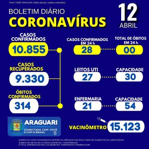 Araguari já aponta 10.855 casos de infecção pelo novo coronavírus, atualmente com 2.157 pacientes em monitoramento, sendo 1.211 confirmados e 946 suspeitos. No que diz respeito à ocupação dos leitos de UTI, são 27 pacientes na Santa Casa de Misericórdia nas 30 vagas disponíveis. Ainda, estão ocupados 21 dos 53 leitos de enfermaria disponíveis nos hospitais de Araguari, sendo três no Santo Antônio, nove na UPA, seis no Hospital de Campanha e três no São Sebastião. Ainda, foram computados 314 óbitos confirmados para a doença, mas nenhum nas últimas 48 horas. As informações constam no último boletim epidemiológico municipal, divulgado pela prefeitura nesta segunda-feira, 12.