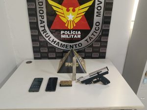 Na noite de quinta-feira, 26, após a realização de diligências desencadeadas a partir de uma denúncia anônima, as equipes policiais lograram êxito em confirmar informações que indicavam que determinados indivíduos estariam na posse ilegal de arma de fogo. Diante da veracidade dos fatos, foi realizada uma ação rápida e eficiente, levando os militares até uma residência no bairro Bela Suíça, culminando na prisão de um indivíduo maior de idade e na apreensão de um menor.