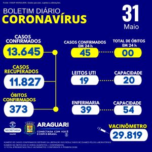Araguari já soma 13.645 casos de infecção pelo novo coronavírus, atualmente com 3.181 pacientes em monitoramento, sendo 1.445 confirmados e 1.736 suspeitos. No que diz respeito à ocupação dos leitos de UTI, são 19 pacientes na Santa Casa de Misericórdia nas 20 vagas disponíveis. Também, estão ocupados 39 dos 54 leitos de enfermaria disponíveis nos hospitais de Araguari, sendo seis no Santo Antônio, nove na UPA, 22 no Hospital de Campanha e um no São Sebastião. Ainda, foram computados 373 óbitos confirmados para a doença, mas nenhum nas últimas 24 horas. As informações constam no último boletim epidemiológico municipal, divulgado pela prefeitura nesta segunda-feira, 31.