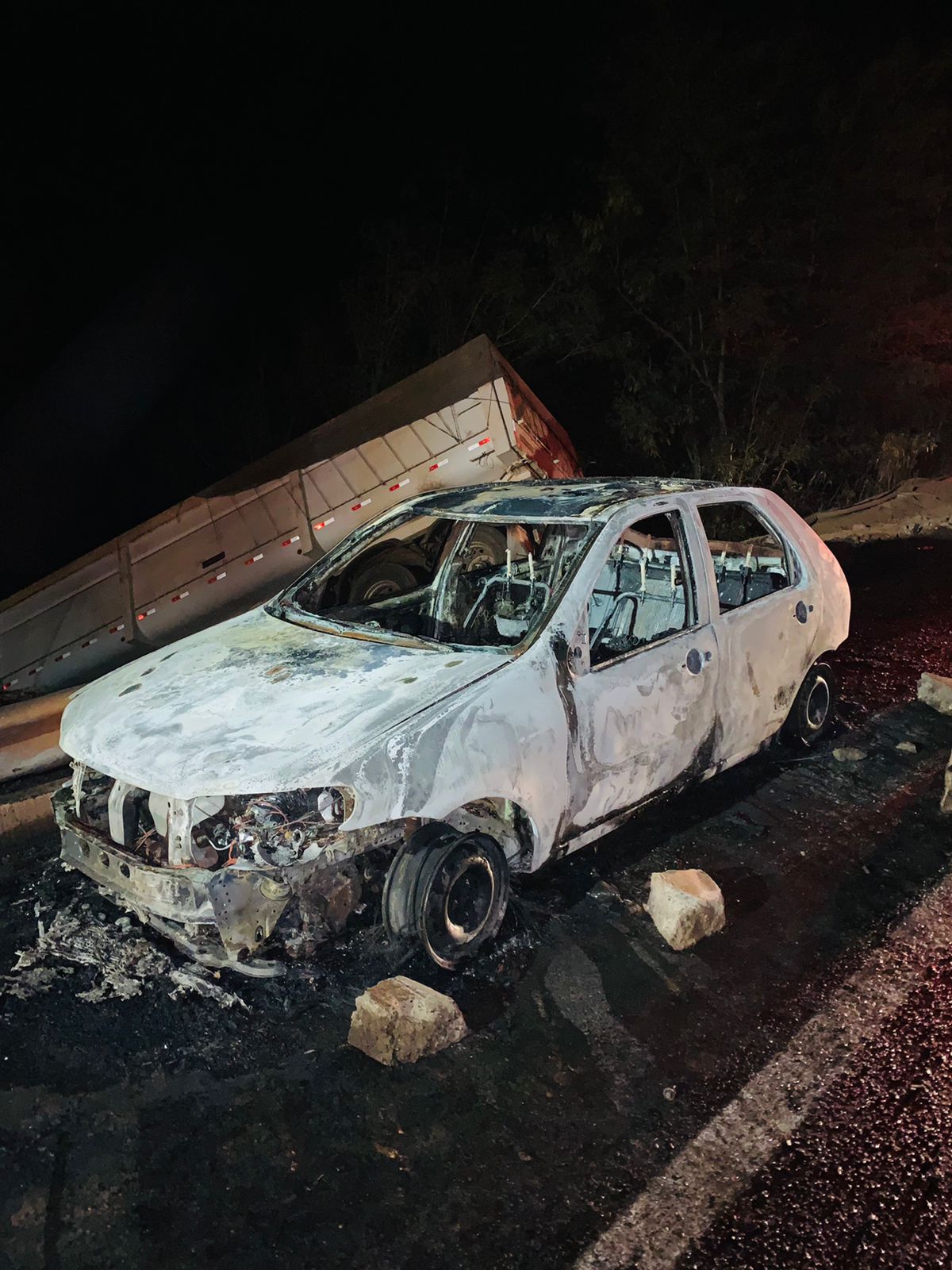 Com o impacto da batida, uma das carretas apresentou vazamento de óleo diesel, gerando um princípio de incêndio às margens da pista. Assim, um veículo de passeio que trafegava no mesmo sentido, se envolveu no acidente e se incendiou.