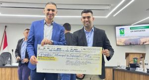 Legenda: O prefeito Selmo Alves de Souza recebeu o cheque simbólico das mãos do presidente da Câmara, Marcos Túlio, consolidando a transparência na gestão pública.