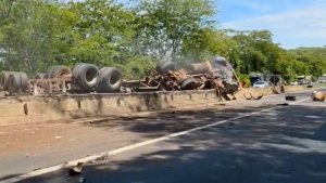 Segundo informações do Centro de Controle Operacional da Ecovias Minas Goiás, ocorreu o tombamento de um caminhão no KM 55, na pista sentido à cidade de Araguari. O registro foi feito às 10h20. O veículo estava carregado com adubo mineral.
