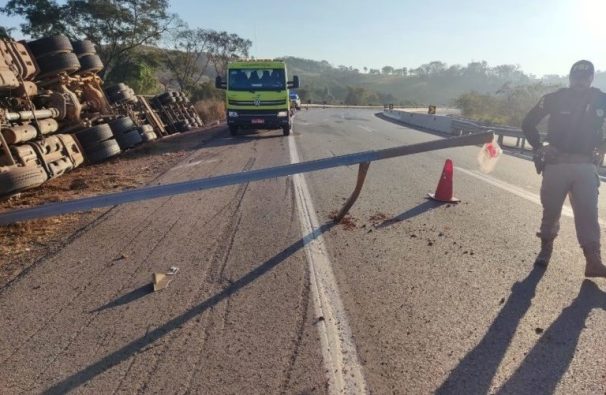 A Polícia Rodoviária Federal e a concessionária que administra a rodovia foram acionadas no começo da manhã, no km 306, onde um veículo Bitrem carregado com algodão em contêineres tombou após perder o controle direcional e sair da pista.