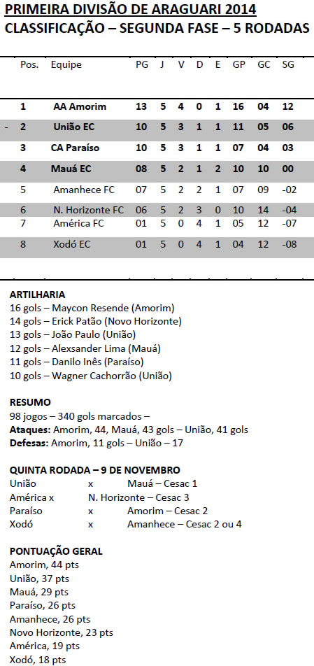 Por outro lado chegam com boas chances o Amanhece, que bateu o América por 2 a 0, gols de Giovanni, e o Novo Horizonte, que goleou o Xodó por 4 a 2, com três gols de Erick Patão, o agora vice-artilheiro do campeonato, com 14 gols, um a menos que Maycon Resende, do Amorim.