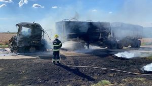 Também na BR-050 um caminhão colidiu contra a traseira de outro caminhão, no domingo à tarde. Com o impacto da batida, o veículo que vinha atrás pegou fogo e ficou completamente destruído. Os condutores escaparam ilesos.