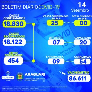 Araguari já soma 18.830 casos de infecção pelo novo coronavírus. No que diz respeito à ocupação dos leitos de UTI, são 7 pacientes na Santa Casa de Misericórdia nas 20 vagas disponíveis. Também, estão ocupados nove dos 54 leitos de enfermaria disponíveis nos hospitais de Araguari. Ainda, foram computados 454 óbitos confirmados para a doença, mas nenhum nas últimas 24 horas. As informações constam no último boletim epidemiológico municipal, divulgado pela prefeitura nesta terça-feira, 14.