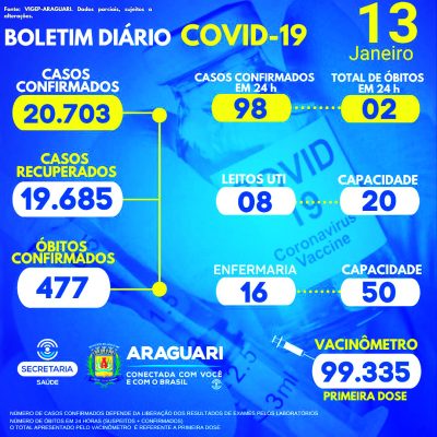 De acordo com as informações do Departamento de Epidemiologia foram registrados os óbitos de uma paciente de 84 anos, portadora de hipertensão arterial sistêmica e diabetes mellitus, além de outra paciente, de 78 anos de idade, acometida por cardiopatia grave e doença renal crônica. Além disso, foram 98 casos confirmados de Covid-19 nas últimas 24 horas. Ainda, oito leitos de UTI e 16 de enfermaria encontram-se ocupados na cidade. No total, 477 pessoas já morreram em Araguari em decorrência do coronavírus.