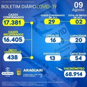 Araguari já soma 17.381 casos de infecção pelo novo Coronavírus, atualmente com 1.439 pacientes em monitoramento, sendo 538 confirmados e 901 suspeitos. No que diz respeito à ocupação dos leitos de UTI, são 16 pacientes na Santa Casa de Misericórdia nas 20 vagas disponíveis. Também, estão ocupados 13 dos 54 leitos de enfermaria disponíveis nos hospitais de Araguari, sendo dois no Santo Antônio, cinco na UPA, quatro no Hospital de Campanha, nenhum na Santa Casa (enfermaria) e dois no São Sebastião. Ainda, foram computados 438 óbitos confirmados para a doença, sendo dois nas últimas 24 horas. As informações constam no último boletim epidemiológico municipal, divulgado pela prefeitura nesta segunda-feira, 9.