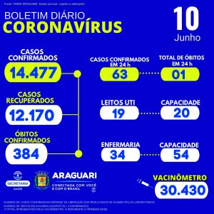 Araguari já soma 14.477 casos de infecção pelo novo coronavírus, atualmente com 4.231 pacientes em monitoramento, sendo 1.923 confirmados e 2.308 suspeitos. No que diz respeito à ocupação dos leitos de UTI, são 19 pacientes na Santa Casa de Misericórdia nas 20 vagas disponíveis. Também, estão ocupados 34 dos 54 leitos de enfermaria disponíveis nos hospitais de Araguari, sendo onze no Santo Antônio, três na UPA, 15 no Hospital de Campanha e três no São Sebastião. Ainda, foram computados 384 óbitos confirmados para a doença, sendo um nas últimas 24 horas. As informações constam no último boletim epidemiológico municipal, divulgado pela prefeitura nesta quinta-feira, 10.