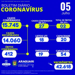 Araguari já soma 15.745 casos de infecção pelo novo coronavírus, atualmente com 3.296 pacientes em monitoramento, sendo 1.273 confirmados e 2.023 suspeitos. No que diz respeito à ocupação dos leitos de UTI, são 18 pacientes na Santa Casa de Misericórdia nas 20 vagas disponíveis. Também, estão ocupados 19 dos 54 leitos de enfermaria disponíveis nos hospitais de Araguari, sendo três no Santo Antônio, sete na UPA, sete no Hospital de Campanha, nenhum na Santa Casa (enfermaria) e dois no São Sebastião. Ainda, foram computados 412 óbitos confirmados para a doença, sendo dois nas últimas 24 horas. As informações constam no último boletim epidemiológico municipal, divulgado pela prefeitura nesta segunda-feira, 5.