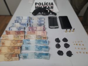 Em continuidades às buscas, os policiais localizaram um revólver Taurus, calibre 32, com três munições intactas, que estava escondido perto do câmbio, e aproximadamente 600 reais. Além desse material, foram apreendidos os celulares dos suspeitos e o automóvel.