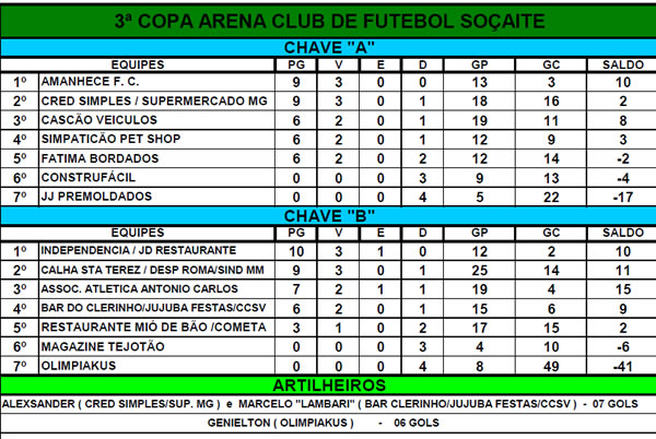 DA REDAÇÃO – Com o clima mais agradável do que nas rodadas anteriores, o domingo foi diferenciado no Arena Club, com a realização da quarta rodada da Terceira Copa Arena Club de Futebol Soçaite. Houve o registro da maior goleada e também a definição das primeiras vagas à etapa seguinte.