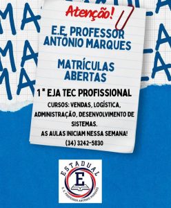 Legenda: Matrículas abertas na Escola Estadual Professor Antônio Marques para a EJA Profissionalizante, que une conclusão do Ensino Médio com cursos técnicos.