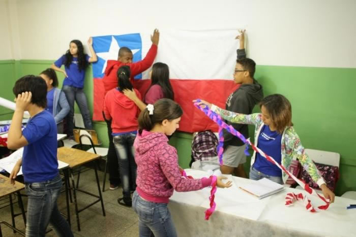 Já sala do 8º ano, a turma se mostrou animada com as cores azul, branco e vermelho. O país? Chile. A turma está afiada sobre assuntos ligados a essa nação. Eles sabem, por exemplo, que fica no Chile o lugar mais seco do planeta: o Deserto do Atacama, com 200 kmd e extensão, localizado em San Pedro de Atacama.
