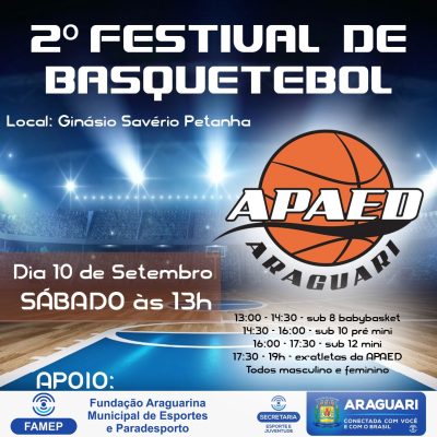 Coordenado pela APAED, em parceria com a Prefeitura de Araguari, FAMEP e Secretaria de Esportes, acontecerá na tarde deste sábado, 10, o 2º Festival de Basquete de Araguari, no Ginásio Savério Petanha, bairro Santa Terezinha, reunindo crianças e jovens entre 6 e 17 anos de idade, além de ex-atletas desta modalidade.