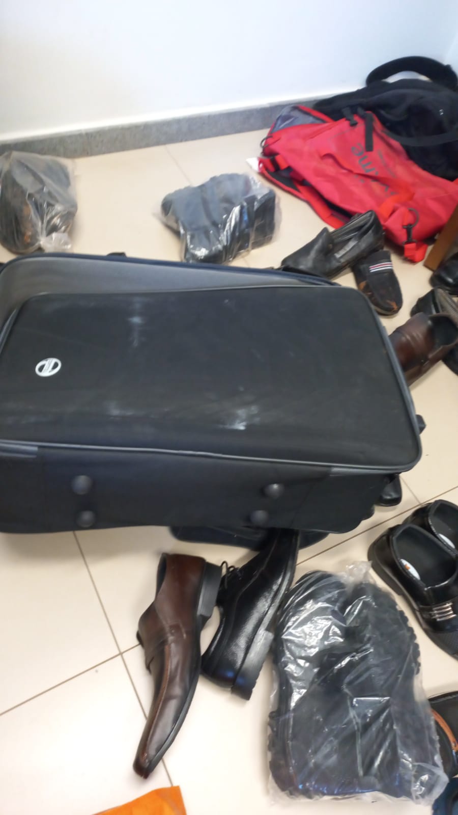 Diante destas informações, as guarnições realizaram diligências e localizaram os produtos do crime, tais como dezenas de pares de meias, chinelos, botinas, cuecas, sapatos, tênis, chuteira, mala de viagem e bolsas. O material apreendido e os suspeitos foram encaminhados à delegacia de plantão da Comarca.