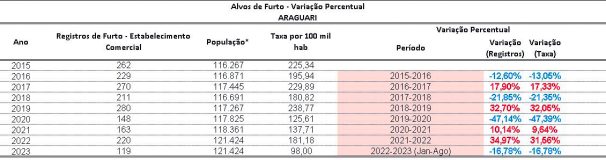 Durante todo o ano de 2022, Araguari teve 220 furtos em comércios (32 apenas em abril). Em 2021, foram 163 ocorrências em 12 meses. No entanto, em 2020, o município teve o menor índice dos últimos oito anos, com 148 registros.
