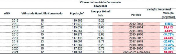 Em Araguari, foram 12 homicídios consumados entre janeiro e agosto de 2021, 50% a mais do que o mesmo período do ano passado. Considerando as principais cidades do Triângulo Mineiro e Alto Paranaíba, além de Araguari, houve aumento nesse tipo de crime em Coromandel (50%), Araxá (25%), Uberlândia (11%).
