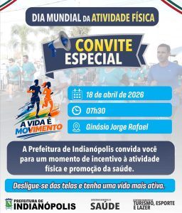 “Cuidar das pessoas é a prioridade da nossa administração. Por isso, convido toda a população para participar do Dia Mundial da Atividade Física. Vamos transformar nosso Ginásio Poliesportivo em um grande palco de saúde e integração social. Sua presença é fundamental para fazermos deste evento um marco na qualidade de vida de Indianópolis”, convidou o Prefeito de Indianópolis Selmo Alves de Souza.