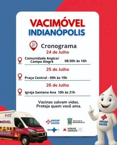 - Sexta-feira, 25 de julho: O Vacimóvel se deslocará para o coração da cidade, estacionando na Praça Central de Indianópolis. Neste dia, o horário de atendimento será estendido, das 09h às 19h, permitindo que trabalhadores e estudantes que têm dificuldade de comparecer durante o horário comercial regular possam ser imunizados. A escolha da Praça Central visa atrair um grande número de pessoas devido à sua localização de fácil acesso e visibilidade.