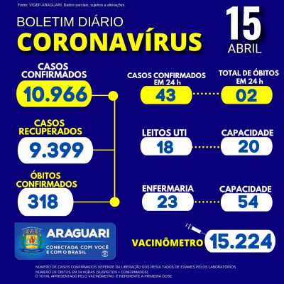 Araguari já soma 10.966 casos de infecção pelo novo coronavírus, atualmente com 2.383 pacientes em monitoramento, sendo 1.249 confirmados e 1.134 suspeitos. No que diz respeito à ocupação dos leitos de UTI, são 18 pacientes na Santa Casa de Misericórdia nas 30 vagas disponíveis. Também, estão ocupados 23 dos 53 leitos de enfermaria disponíveis nos hospitais de Araguari, sendo cinco no Santo Antônio, três na UPA, 14 no Hospital de Campanha e um no São Sebastião. Ainda, foram computados 318 óbitos confirmados para a doença, sendo duas mortes nas últimas 24 horas. As informações constam no último boletim epidemiológico municipal, divulgado pela prefeitura nesta quinta-feira, 15.
