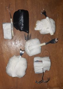 Após intensa varredura, as equipes localizaram o menor escondido e deitado no matagal, com uma sacola a qual continha três celulares embalados em fita isolante com haste de metal modificada para guincho, uma embalagem contendo baterias e carregadores de celulares e dois tabletes de substância esverdeada semelhante à maconha.