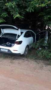 O automóvel Chevrolet/Ônix, cor branca, foi localizado numa estrada vicinal, proximidades do bairro Bela Suíça, com alguns pertences, enquanto os autores evadiram numa região de mata.