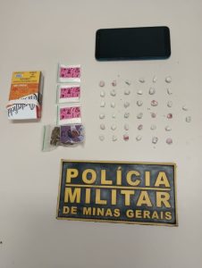 Ainda durante busca pessoal, foram localizadas embalagens com buchas de substância análoga à maconha e porções de substância análoga à cocaína, além de um telefone celular.