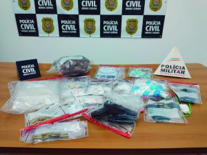 Uma arma de fogo calibre 9mm; 36 munições; 200 gramas de cocaína, comprimidos de ecstasy, drogas avaliadas em R$ 22.mil; 500 pinos usados para embalar cocaína; 13 porções de maconha de tamanhos variados; 10 pedras de crack; duas balanças de precisão; 12 aparelhos celulares e R$ 1.176 em dinheiro.