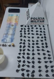 A equipe diligenciou no imóvel e localizou uma sacola com mais 100 dolas da mesma substância e 238 reais em notas e moedas diversas. Assim, o jovem recebeu voz de prisão em flagrante e foi levado para a delegacia de plantão da Polícia Civil junto com o material apreendido. A moto foi removida para um pátio credenciado pelo Detran de Minas Gerais.