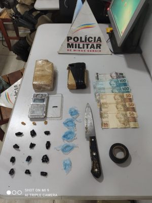 Após o patrulhamento, foi localizada uma pessoa, de 20 anos, com as características repassadas pela denúncia com uma faca e uma sacola na mão. O suspeito tentou se evadir da abordagem, mas sem êxito, sendo constatado que portava uma faca utilizada para ‘picar’ entorpecentes, uma balança de precisão, 12 ‘pedras’ de substância parecido com crack, duas barras de substância análoga à maconha, três pedras de crack e materiais utilizados para o embalo dos entorpecentes.