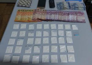 Foi efetuada busca pessoal no suspeito, que portava duas dolas de substância semelhante à cocaína, além de 275 reais em notas diversas e dois aparelhos celulares.