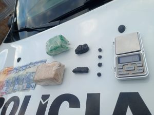 Após diligências, um autor, de 25 anos, foi encontrado e no local, os militares encontraram um saco plástico cheio de flores de maconha, uma balança de precisão, um caderno e um aparelho celular.