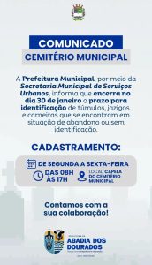 Prefeitura de Abadia dos Dourados convoca população para identificação obrigatória de túmulos até 30 de janeiro
