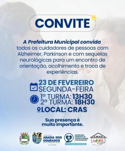 A Prefeitura Municipal de Abadia dos Dourados, reafirmando seu compromisso com a saúde e o bem-estar da nossa população, convida carinhosamente todos os cuidadores de pessoas com Alzheimer, Parkinson e outras sequelas neurológicas para um momento único de aprendizado e troca de vivências.