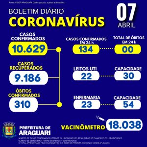 Araguari já soma 10.629 casos de infecção pelo novo coronavírus, atualmente com 2.118 pacientes em monitoramento, sendo 1.133 confirmados e 985 suspeitos. No que diz respeito à ocupação dos leitos de UTI, são 22 pacientes na Santa Casa de Misericórdia nas 30 vagas disponíveis. Ainda, estão ocupados 23 dos 53 leitos de enfermaria disponíveis nos hospitais de Araguari, sendo dois no Santo Antônio, um na UPA, 14 no Hospital de Campanha e cinco no São Sebastião. Foram computados 310 óbitos confirmados para a doença, mas nenhum nas últimas 24 horas. As informações constam no último boletim epidemiológico municipal, divulgado pela prefeitura nesta quarta-feira, 7.