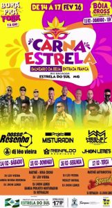 O Carna Estrela contará com uma programação artística diversificada, reunindo diferentes estilos musicais e atividades esportivas tradicionais. No sábado, 14 de fevereiro, a abertura será com DJ Léo Vieira, Banda Nossa Resenha e DJ Jhon Lemes. No domingo, 15, o destaque fica para o tradicional Bóia Cross, com a descida pelo Rio Bagagem às 15h, além de matinê e apresentações de DJ Léo Vieira, DJ Jhon Lemes, Banda Projeto Misturadin e DJ Reynaldo. Na segunda-feira, 16, a folia continua com DJ Léo Vieira, Wesley Morall e DJ Jhon Lemes. Já na terça-feira, 17, o evento será encerrado com a Matinê Automotiva, comandada pelo Jr. Sound, além de shows de DJ Reynaldo e DJ Jhon Lemes.O prefeito Sebastião da Silveira reforçou o convite à comunidade, destacando que o evento é fruto de um planejamento que prioriza o lazer acessível e a valorização das tradições de Estrela do Sul. Em sua fala institucional, o chefe do executivo ressaltou o espírito da nova gestão:
