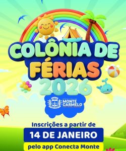 Com o objetivo de proporcionar momentos de lazer, integração social e desenvolvimento físico para o público infantil, a Prefeitura Municipal de Monte Carmelo tem a satisfação de anunciar a abertura das inscrições para a Colônia de Férias 2026.