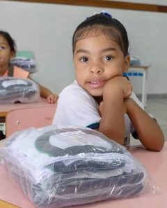 Cada aluno recebeu um kit completo, cuidadosamente pensado para atender às diversas necessidades climáticas e de uso diário. O conjunto é composto por camiseta, calça, blusa de frio e, para as meninas, um prático short-saia. Essa composição garante que os estudantes estejam adequadamente vestidos em todas as estações do ano, permitindo que se concentrem nos estudos sem preocupações com o frio ou o calor.