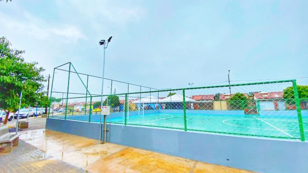 A praça possui quadra para prática de esportes, área verde e academia ao ar livre.