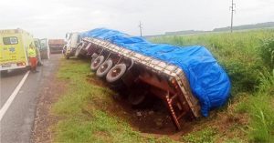 Tempo chuvoso provoca tombamento de carreta na rodovia