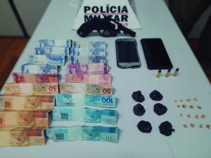 Em continuidades às buscas, os policiais localizaram um revólver Taurus, calibre 32, com três munições intactas, que estava escondido perto do câmbio, e aproximadamente 600 reais. Além desse material, foram apreendidos os celulares dos suspeitos e o automóvel.