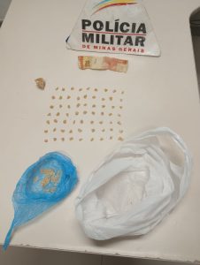 Com a jovem estava uma pedra maior e 20 reais. O homem portava uma sacola com a quantidade maior da substância análoga ao crack, inclusive com um pouco de farelo da mesma substância.