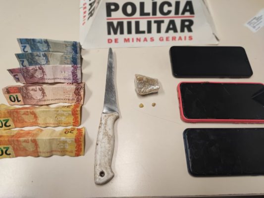 Foram apreendidas três pedras de substância análoga ao crack, prontas para o comércio. Uma delas, segundo os militares, totalizaria aproximadamente 200 pedras. A equipe encontrou ainda três telefones celulares, uma faca e 59 reais em dinheiro.