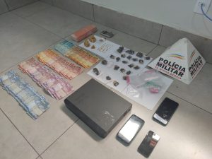 Após denúncia sobre o tráfico de drogas num estabelecimento comercial, a Polícia Militar compareceu à rua Maria Cândida Peixoto, bairro Miranda. Um jovem de 20 anos foi abordado e teria informado o local onde estavam os entorpecentes. Foram apreendidas 24 pedras de substância semelhante ao crack, uma lâmina de aço, a quantia de 221 reais em notas diversas e uma balança de precisão, além do aparelho celular do suspeito.